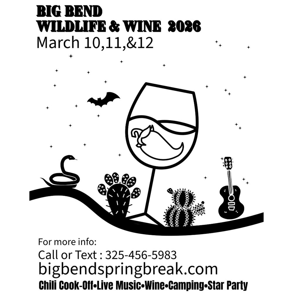 The Big Bend Wildlife & Wine Festival takes place on a 100-acre property just outside the Terlingua Ghost Town. Reserve a campsite for $75. Good for March 9 - 13 2026. Checkout by 11am on March 13.